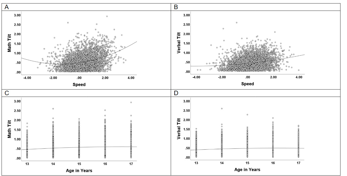 Although the quadratic effects of age on academic tilt were significant, they were trivial in size = -.04 to -.03, Tables 1 and 3) and were coupled with trivial linear effects of age on academic tilt = -.01 to .03, Tables 1 and 3) and with relatively large positive linear effects of speed on academic tilt = .06 to .22, Tables 1 and 3). The trivial size of the quadratic and linear effects of age on academic tilt may be attributable to speed, a hypothesis consistent with age-based speed theories (see also, Coyle, 2022, 2023b; Kail, 1991, 2000). Consistent with this hypothesis, age was significantly (and positively) related to academic tilt before controlling for speed (r = .09 to .13, Appendix C) but not after controlling for speed = .02 to .03, Tables 1 and 3), suggesting that age effects on tilt were attributable to speed. The negligible age effects (after controlling for speed) are consistent with research indicating that speed mediates age-academic tilt relations (e.g., Coyle, 2023b, his Table 4; see also, Fry & Hale, 1996; Tourva & Spanoudis, 2020). Together, such findings suggest that speed largely explains increases in academic tilt in the age range sampled (13- to 17-years) and that after accounting for speed, linear or quadratic effects of age have negligible effects on academic tilt.