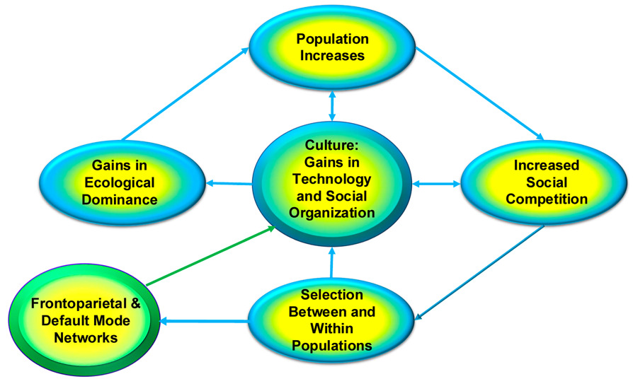 Repeating cycles of population expansion and contraction will accelerate evolutionary selection and favor traits that provide a competitive advantage over others in terms of social influence and control of culturally important resources (Geary, 2021). There are probably many such traits (e.g., healthy immune system), and fluid intelligence was likely one of them (Geary, 2005). As shown in Figure 1, my suggestion is that fluid intelligence and related competencies (e.g., for creativity and associated DMN brain systems described below) facilitated the creation of novel technologies, social strategies, and patterns of social organization that resulted in competitive advantage. Gains in fluid and related abilities then increased the potential of the remaining population (after the crash) to make further technological and other gains. We cannot directly study the associated social dynamics among early species of Homo or early modern humans, but evidence for this proposal is found in the historical record.